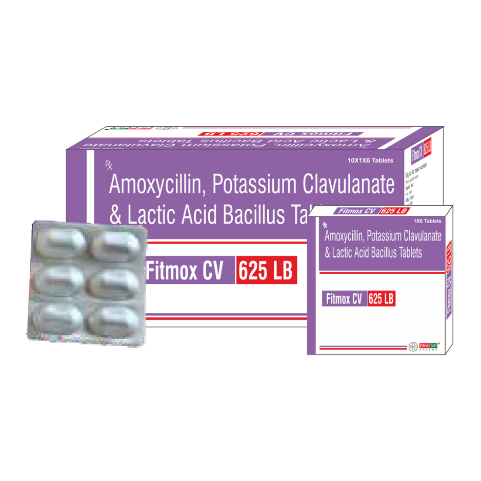 FITMOX-CV 625 LB TABLET is a triple-action antibiotic formulation designed for adults and adolescents. It contains Amoxycillin 500mg a broad-spectrum penicillin antibiotic; Clavulanic Acid 125mg a β-lactamase inhibitor; and Lactic Acid Bacillus 60 million spores a beneficial probiotic.