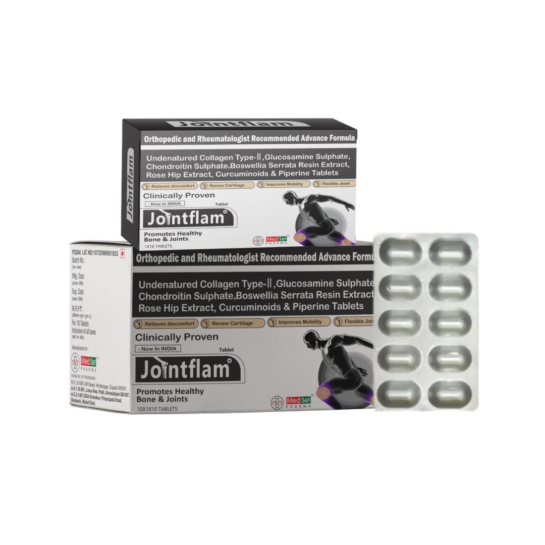 JOINTFLAM TABLET is an advanced joint support formula enriched with Collagen Type-II, Glucosamine, Curcuminoids, and Boswellia Serrata to promote joint flexibility, reduce pain, and support cartilage health.